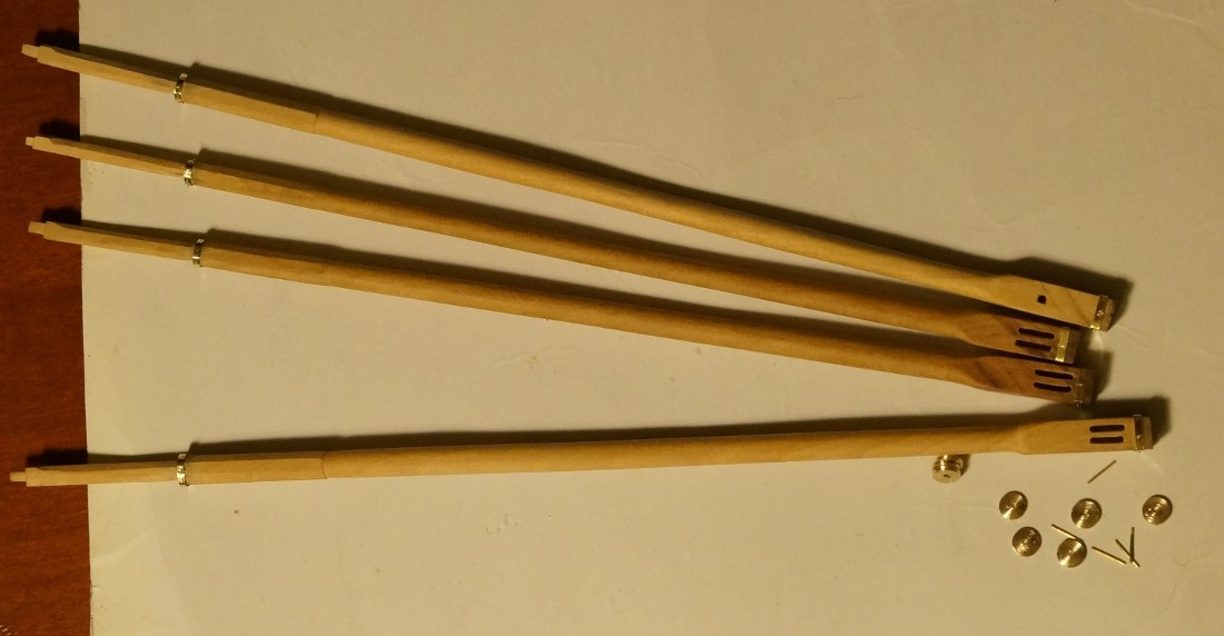 Na początek zabawy z omasztowaniem zrobiłem stengi wraz z zapasowym kompletem, który był składowany na pokładzie nad szalupami. Krążki mosiężne z pręta fi 5mm.