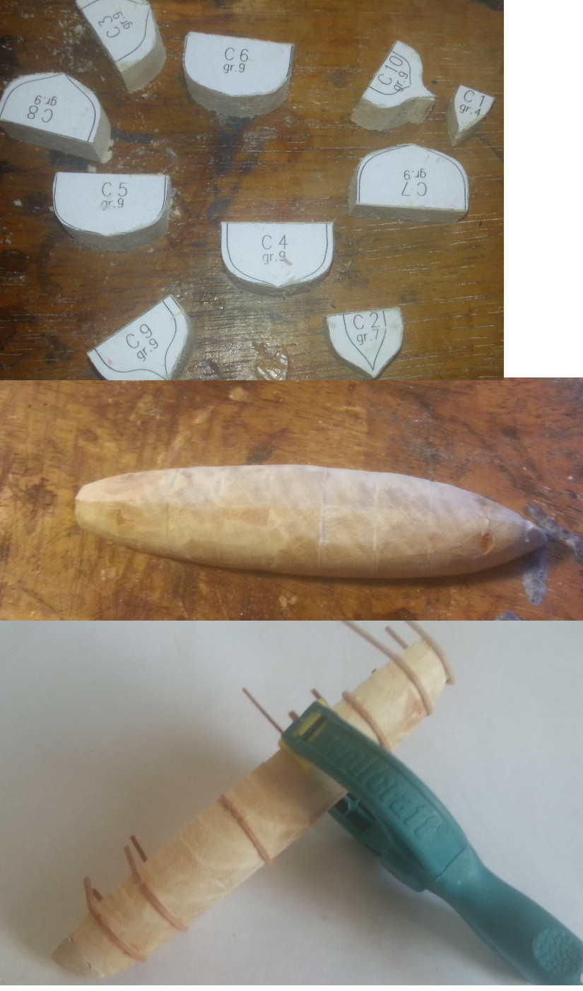 Szalupy zasadniczo robiłem tak jak zostało to już w wielu miejscach opisane. Kopyta robiłem z przekrojów poprzecznych. Na każdym z nich narysowałem sobie również obrys następnego klocka i sfazowałem przed sklejeniem w całość. Dzięki temu później były potrzebne już tylko kosmetyczne zabiegi.