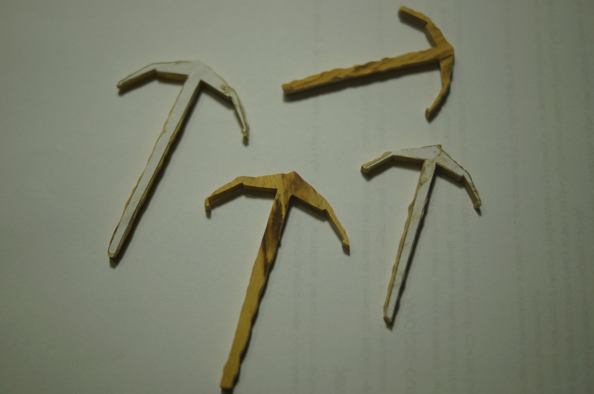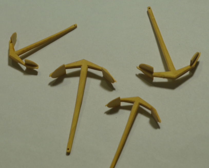 W oczekiwaniu na rozwiązanie problemu pilarki (zajechany pasek napędowy) zrobiłem kotwice. Jako materiału użyłem bukszpanu, zabejcowałem na czarno i później pociągnąłem to metalizerem "dark iron". Najwięcej zabawy było z lutowaniem tych "stalowych" obręczy.