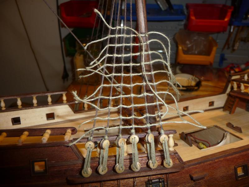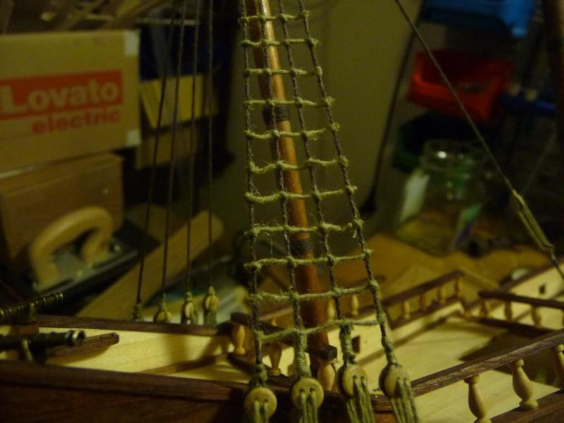 Nadszedł czas na wykonanie olinowania. Przedstawiam kilka fotek etapu, gdzie wykonywałem wanty oraz wyblinki. Było to dla mnie coś nowego i trochę tych węzłów trzeba się narobić. Po jakimś czasie doszedłem do wprawy i nawet szybko szło.