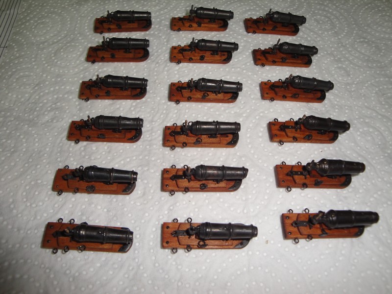 Po zlozeniu i sklejeniu dwoch dzial, uzbrojenie Niagary jest zakonczone. Lawety z czerwonego drzewa "red heart", jakby inaczej, CNC od Mirka. Lufy z Polski od rbmodel.com. Kola czernione tuszem kreslarskim. Przy czernieniu chemicznym wiekszych elementow (np lufy) nastepujace kroki: wstepne oczyszczenie mechaniczne przy pomocy welny/waty stalowej (gospodarstwo domowe-czyszczenie garnkow), nastepnie odtluszczanie-aceton, mycie woda, czernienie roztworem kwasu selenowego (1:1 z woda)10-15sek, mycie woda, suszenie, lekkie polerowanie np. flanela z ev. dodatkiem proszku grafitowego. Przy mini-elementach odpada krok pierwszy i ostatni. I to juz chyba wszystko. Praktycznie zlozylem do kupy gotowe elementy jak z zestawu, troche poglaskalem, pociagnalem olejem lnianym, i tak to wyszlo.