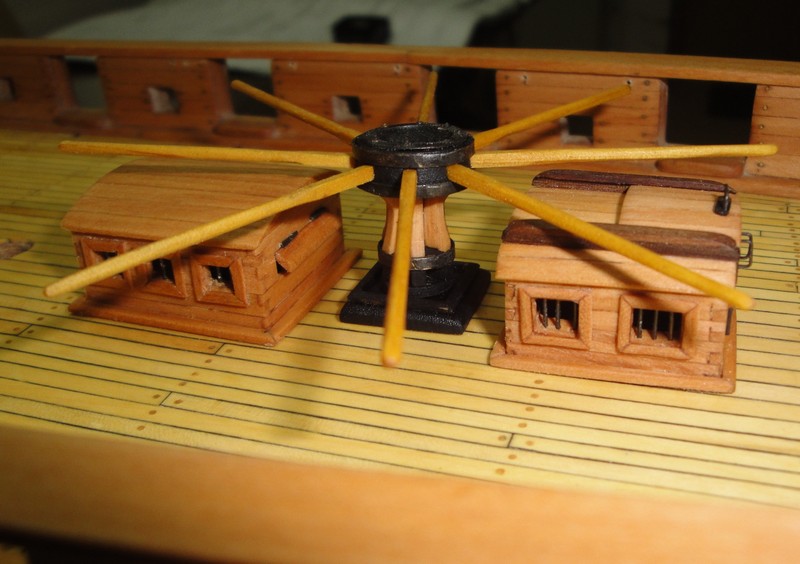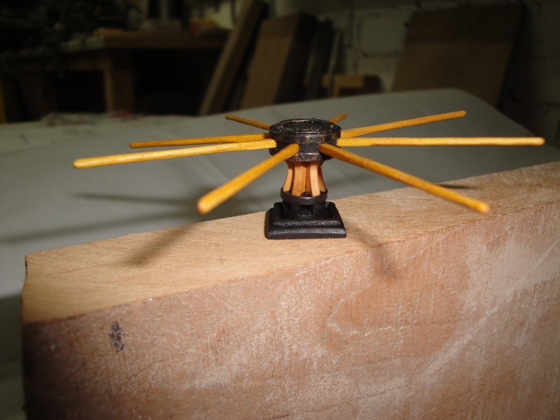 Coraz wiecej drobiazgow pomalu dochodzi: zmajsterkowalem kabestan. Elementy drewniane z gruszy Mirkowej roboty, uzbrojenia metalowe z blachy mosieznej 0,3mm czernione, jak wszystko inne tez, kwasem selenowym. "Patyczki" z bukszpanu.