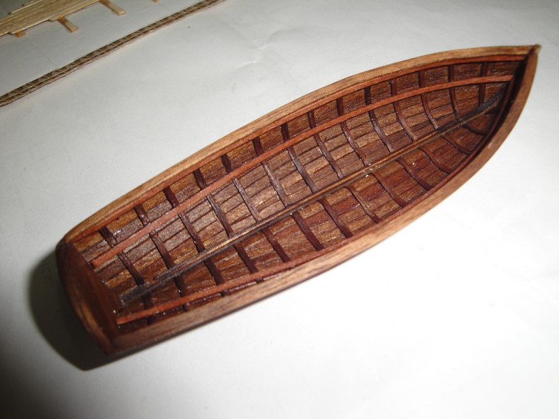 Kopytko jest z gipsu, wregi 1x0,6mm, deski poszycia 2x0,6mm, drzewo to orzech. Mokre listewki formuje malym zelazkiem.Dlugosc szalupy bez steru 90mm