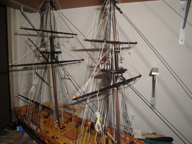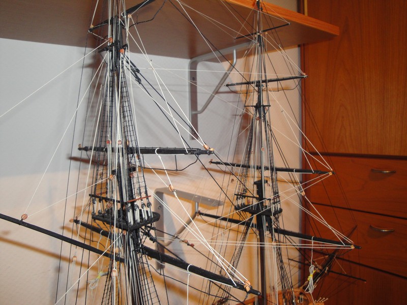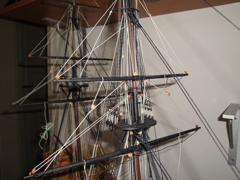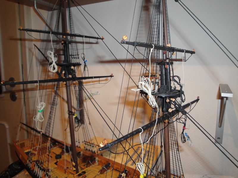 Wszystkie reje na miejscu. Doszlo tez troche nowych linek. Pomalu zaczyna toto wygladac jak zaglowiec.
