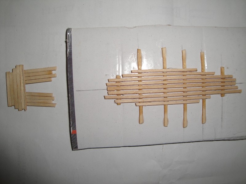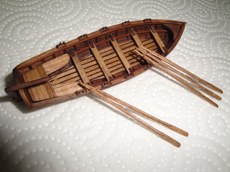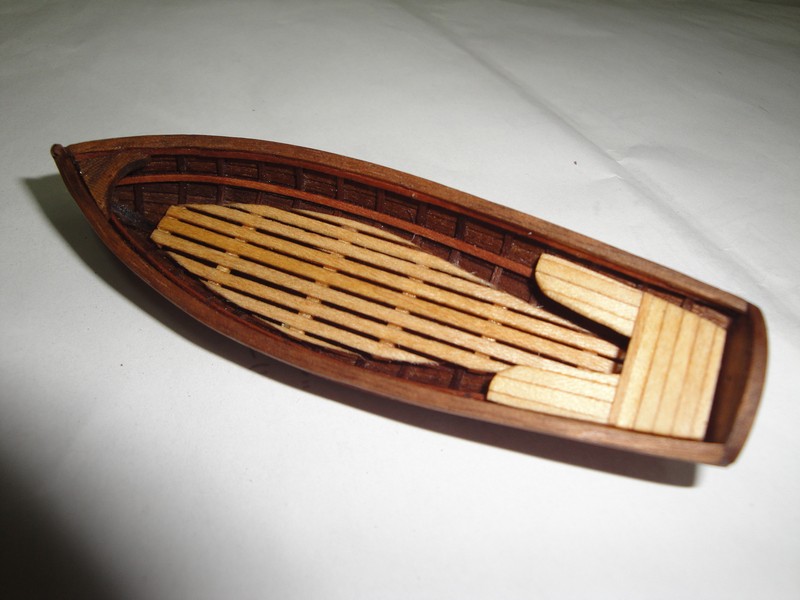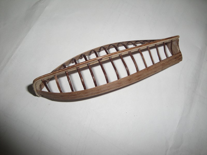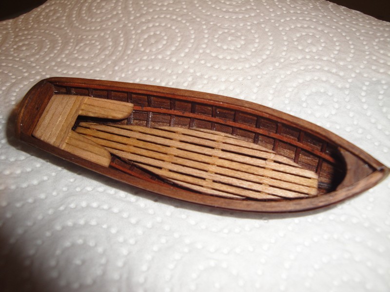Kopytko jest z gipsu, wregi 1x0,6mm, deski poszycia 2x0,6mm, drzewo to orzech. Mokre listewki formuje malym zelazkiem.Dlugosc szalupy bez steru 90mm