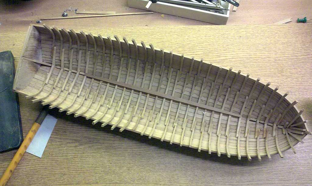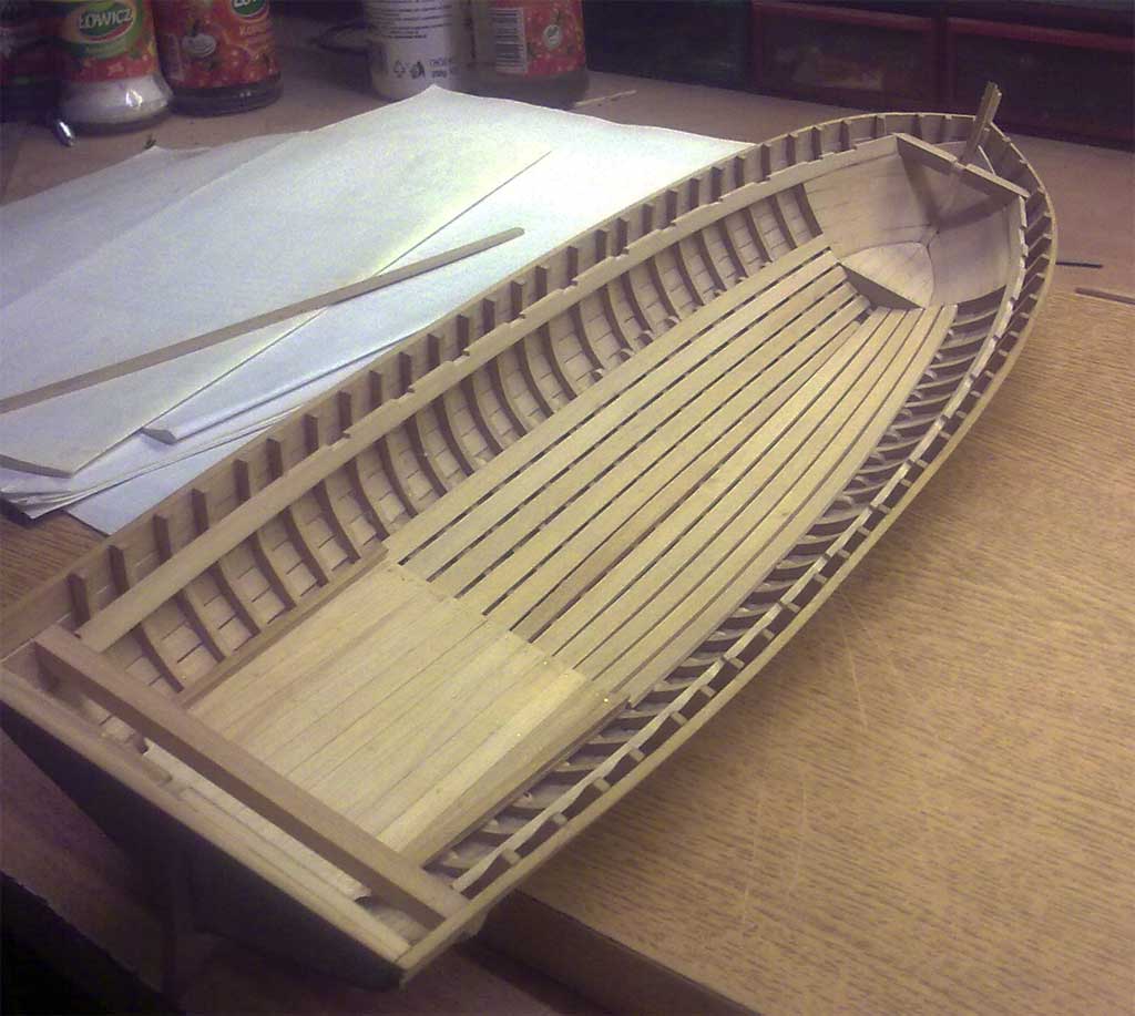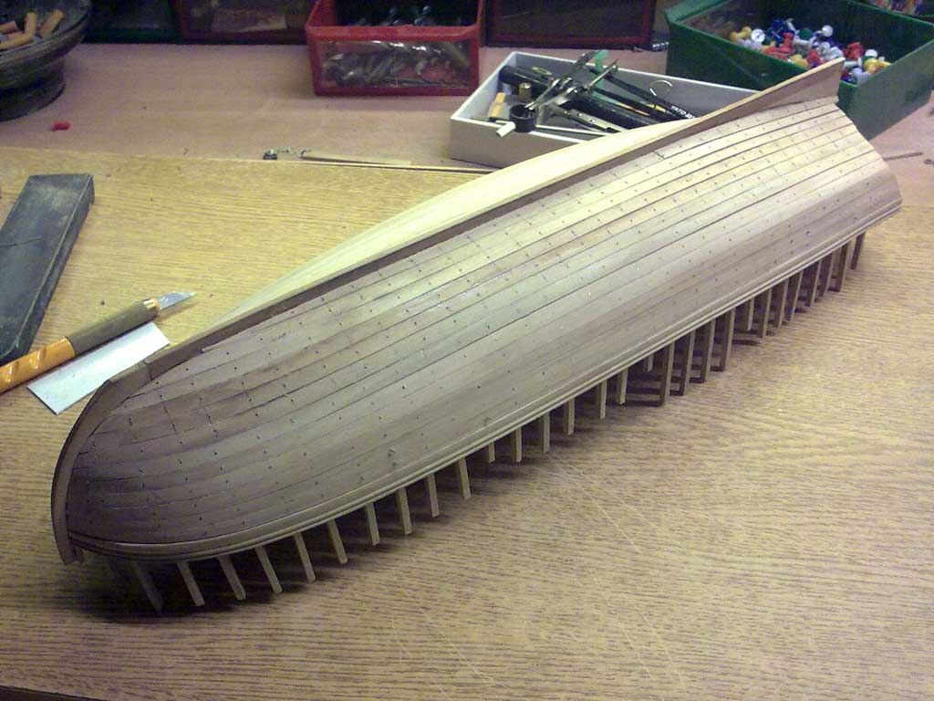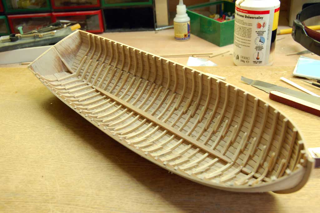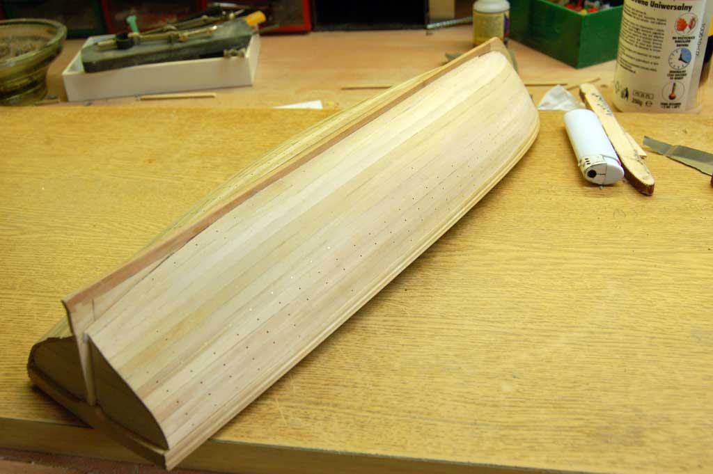 No tak dzisiaj skończone poszycie i jak tylko podeschło to nie wytrzymałem żeby choć na chwilkę zajrzeć do środka. Kadłub z kopyta wyszedł bez problemu (uff) A że teraz szlifowania sporo to nic nie szkodzi lepiej jak jest za dużo kleju niż za mało