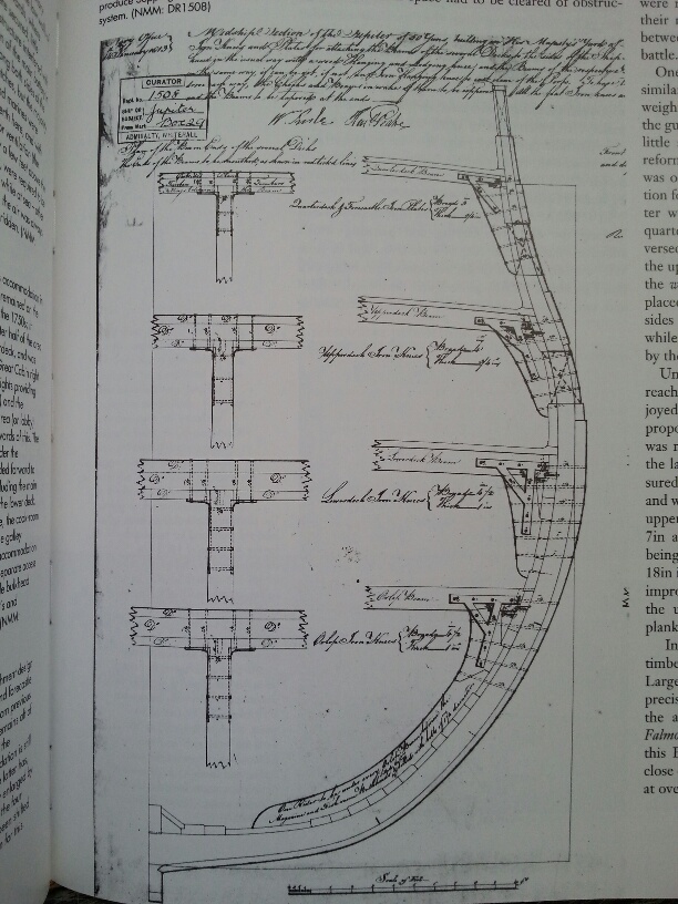 Jarcio, z racji tego, że mój angielski jest jaki jest nie podejmuję się tłumaczenia tego cytatu. Zapożyczyłem z angielskiej książki pt. Okręt 50-cio działowy oryginalną ikonografię, która ukazuje , że było podobnie jak we francuskich okrętach. Przynajmniej na zewnętrznym poszyciu.