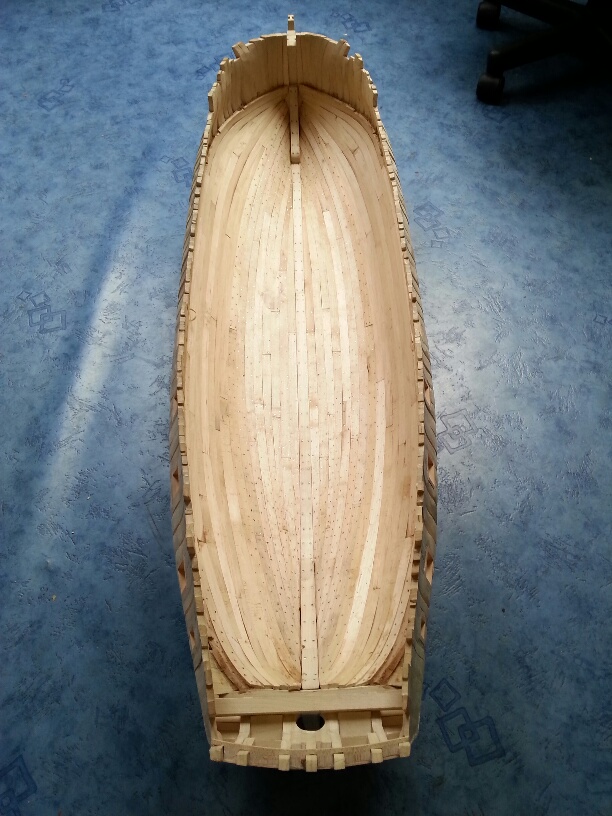 Poszycie wewnętrzne w części rufowej ukończone. Na dziobie pozostało dociąć i dokleić po trzy niewielkie fragmenty na burtę. Następnie szlifowanie i dokończenie gwoździowania.