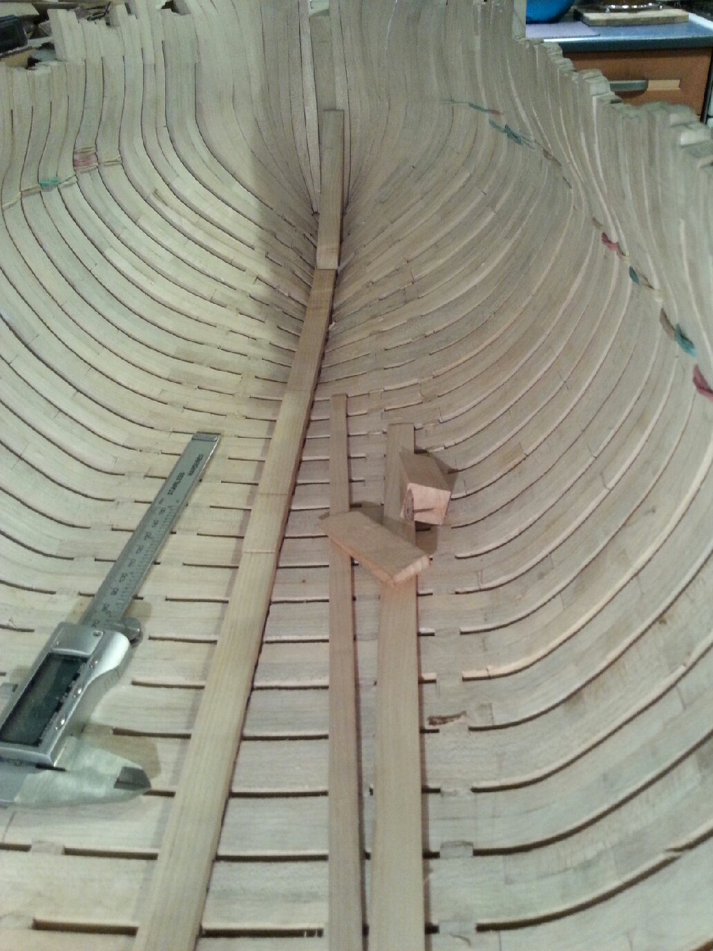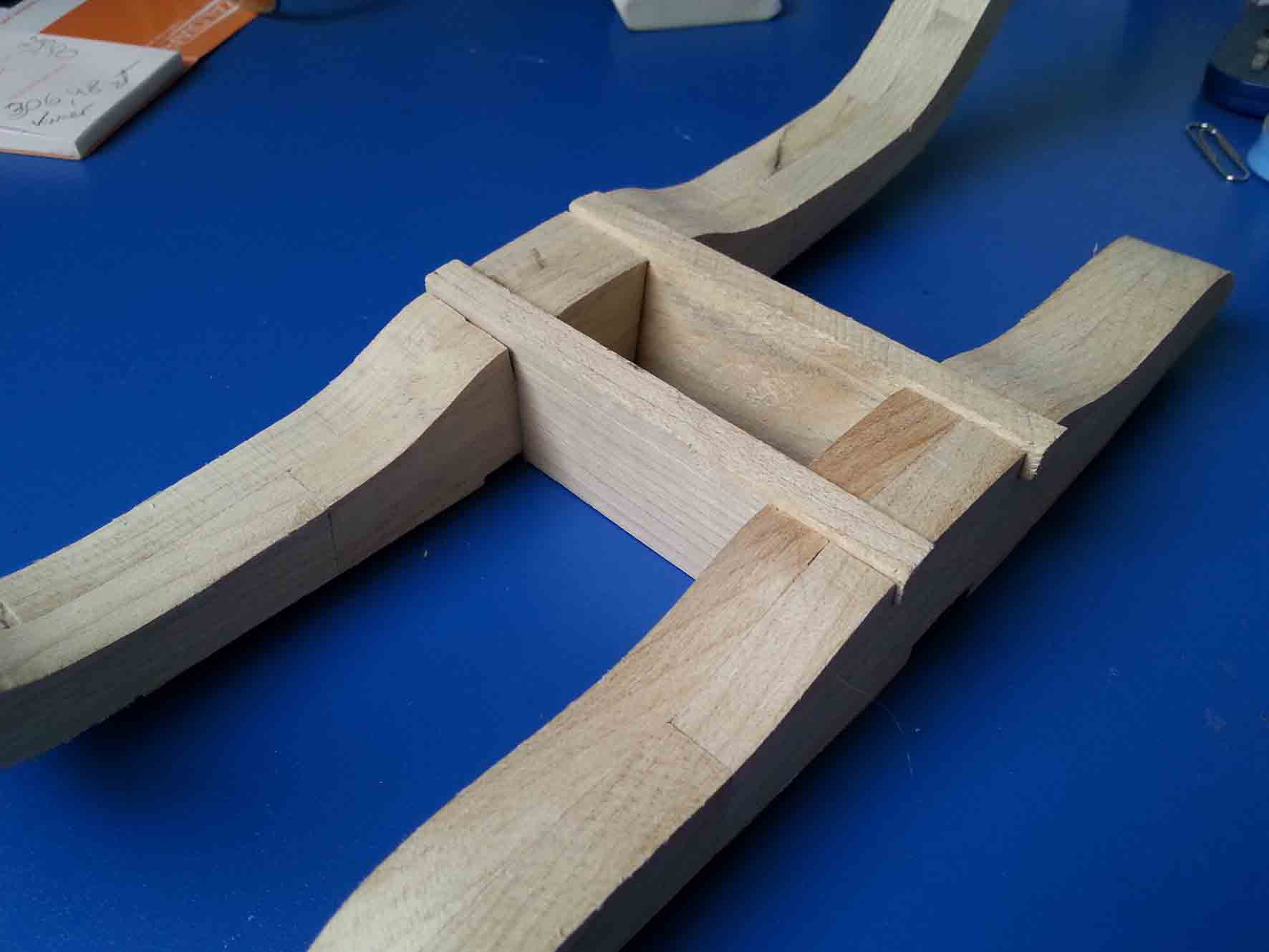 Cd.wypełnienie dziobu wklejone i od wewnątrz wstępnie szlifowane. Dopasowuję nadstępkę. Na razie jestem mile zaskoczony. Niewielkie korekty rzędu kilku 1/10 mm w paru przypadkach.
