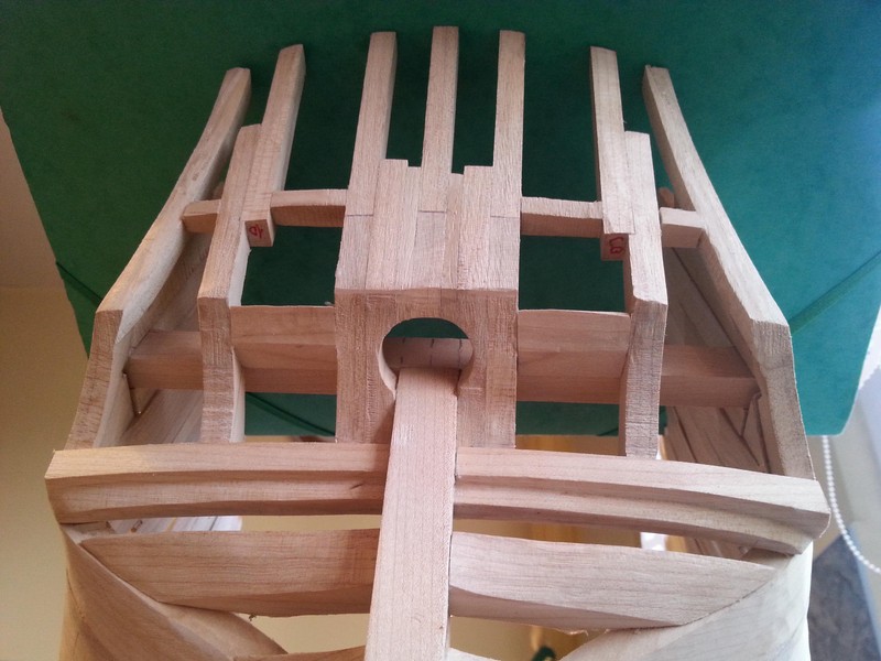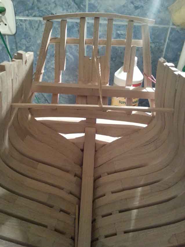 Zamieszczam nowe zdjęcie rufy. Wysokość elementów jest z niewielkim naddatkiem na doszlifowanie. To samo tyczy się kilku elementów wypełnienia burt w części rufowej.