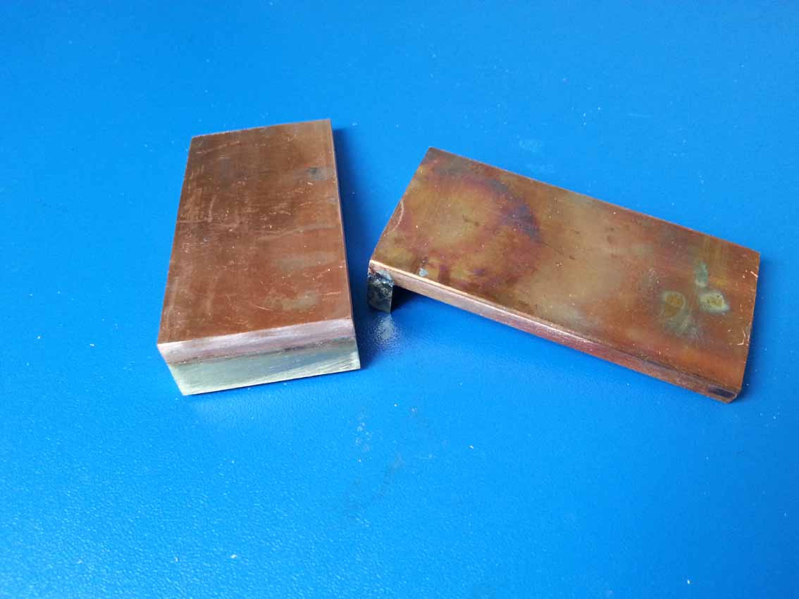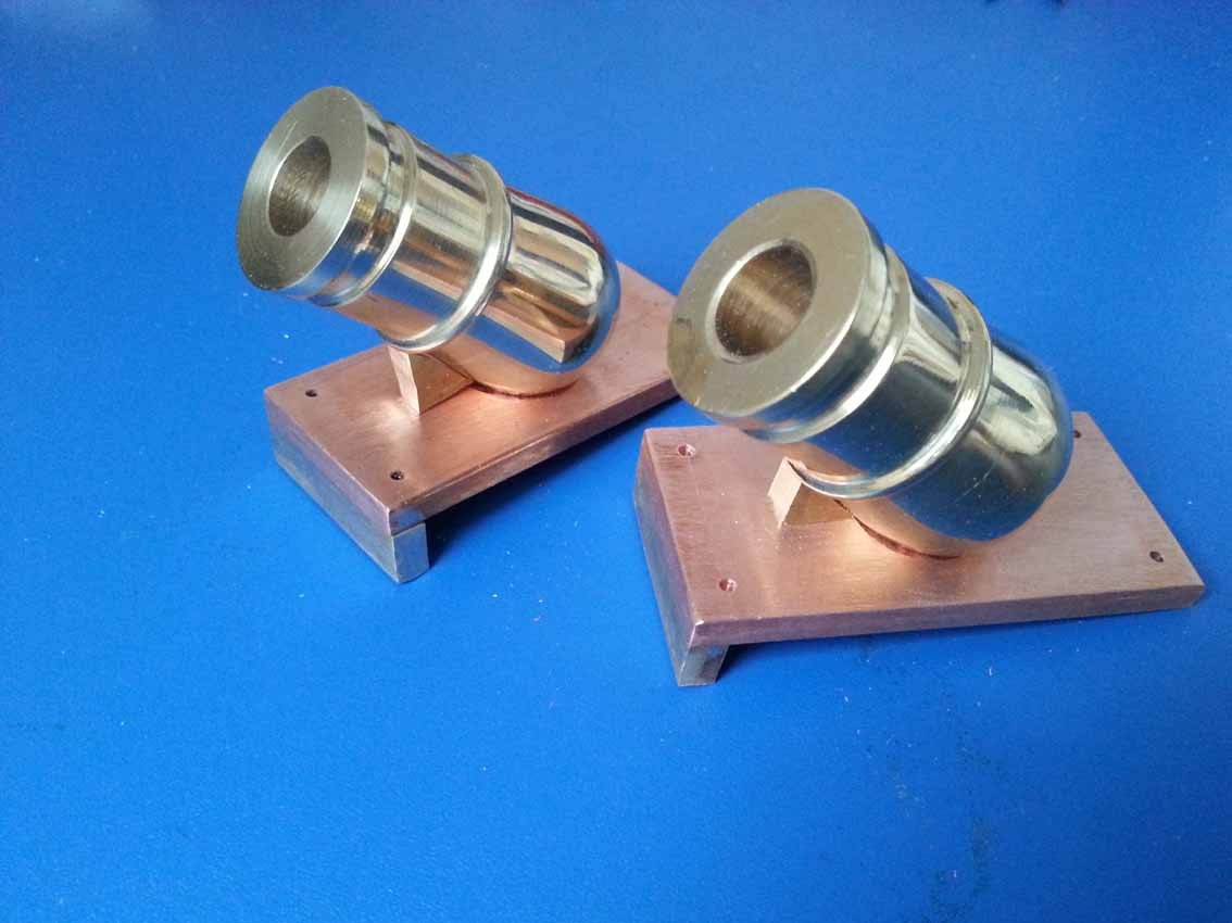Zlutowane podstawy pod moździerze.Prowizoryczna przymiarka ustawienia moździerzy na podstawach. Przymocowane do podstaw za pomocą wosku.Podstawy zrobione z płaskownika miedzianego grubości 5 mm.