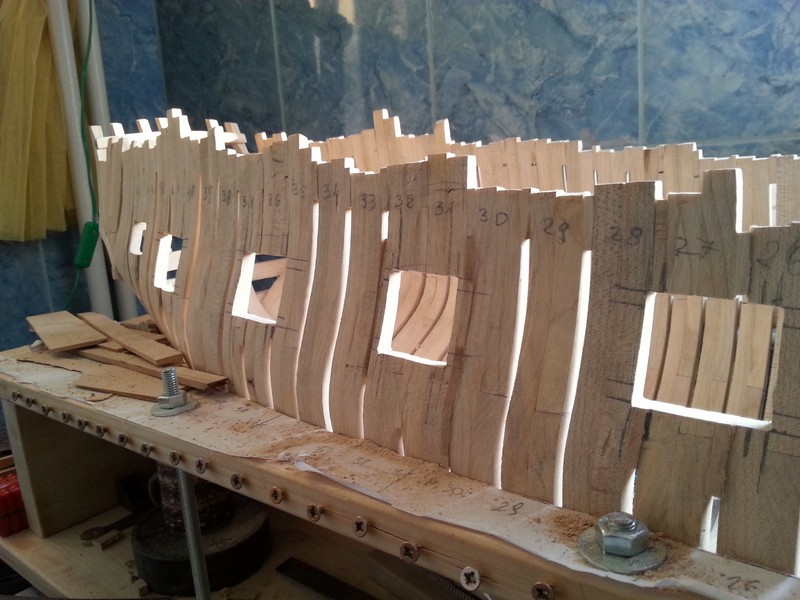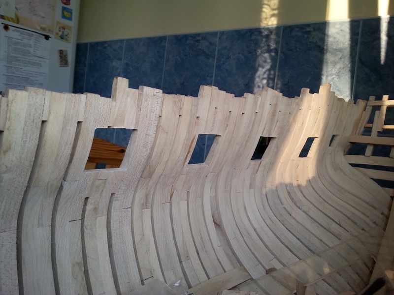 Wykreśliłem na burtach linie pod otwory na furty działowe.