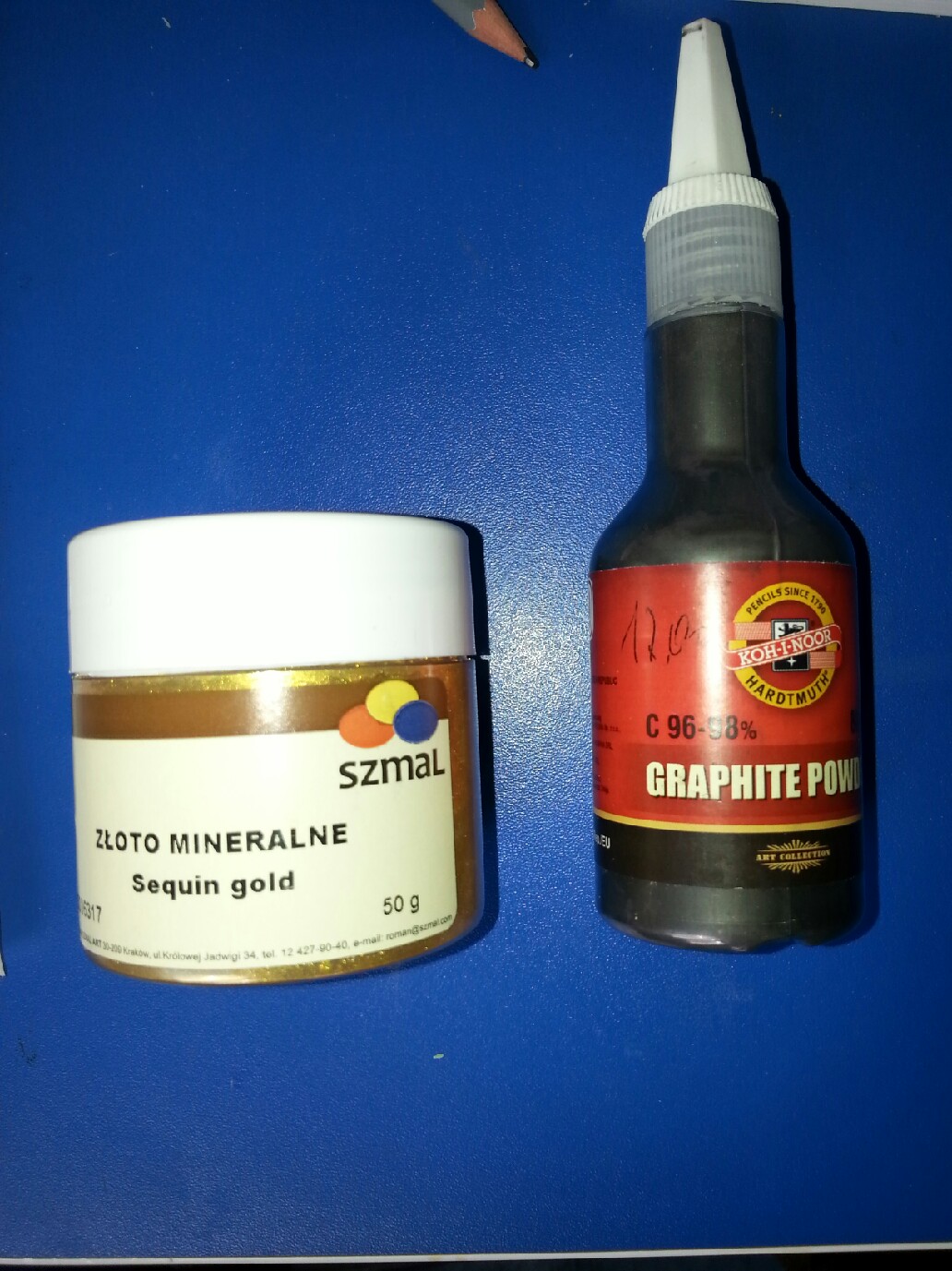 Próba z odlewaniem barwionej na złoto żywicy. Barwniki kupione w sklepie dla plastyków. Grafit powinien załatwić sprawę czernienia lufy. Zobaczymy.