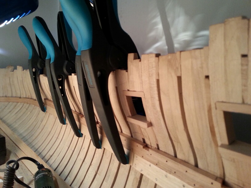 Budowa modelu w skali 1/24 ma dodatkową zaletę, duże odległości między wręgami. Po usunięciu ogranicznika można używać śrubowych ścisków stolarskich.