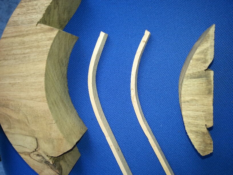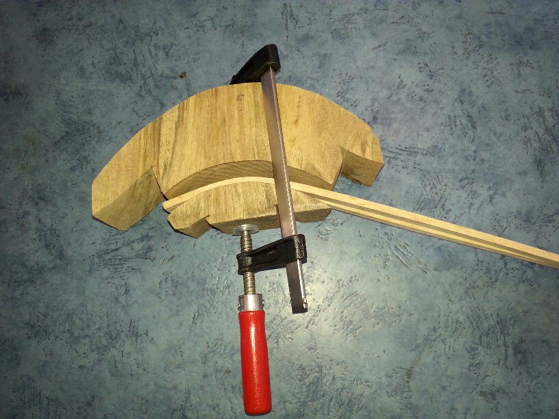 Listwy przeznaczone do wygięcia gotuję przez kilka minut. Czas zależny jest od gatunku drewna i grubości. Należy go dobrać doświadczalnie. Listwy wyginam na szablonach zewnętrznych i wewnętrznych. Używam ścisków sprężynowych i śrubowych.Dokręcać należy z wyczuciem i stopniowo powoli,bo mimo rozmiękczenia drewno lubi pękać.Listwy powinny być cięte idealnie wzdłuż słoi.Wiąże się to ze znacznymi stratami drewna w wielu przypadkach.