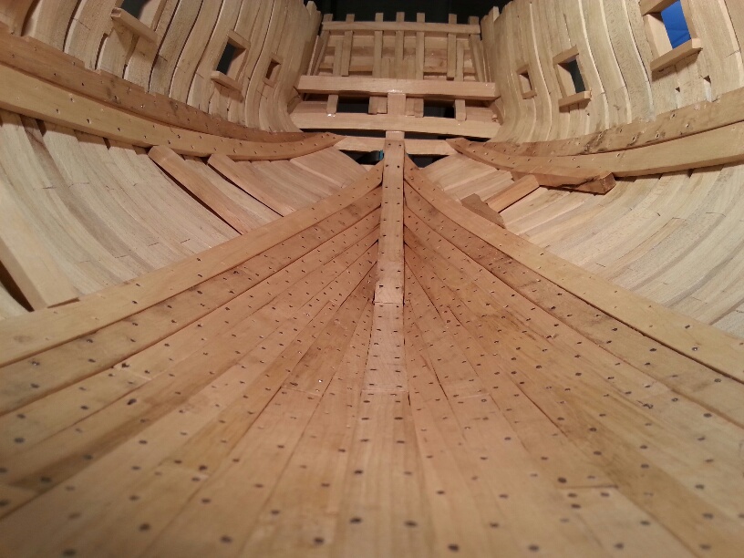 Przybywają kolejne deski poszycia wewnętrznego. Różnią się minimalnie grubością (stąd cienie pomiędzy nimi) ponieważ grubość poszycia rośnie od stępki do pokładu od 3,5mm do 6 mm. Po pokryciu całej powierzchni wewnętrznej będę całość szlifował aby uzyskać płynne przejście grubości desek. Na zdjęciu widoczne są rozpóki dociskające deski w czasie schnięcia kleju. Brakuje części gwoździ w ostatnio przyklejonych deskach.