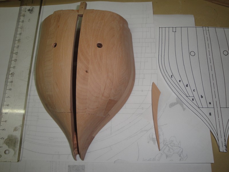 Zabralem sie za krzywulce na dziobie. Zastosowalem metode z szablonem i sukcesywnym przymierzaniem i szlifowaniem krawedzi (podobnie jak Kagra w swojej relacji). Po zastosowaniu lekkich korektur, wyszlo jak wyszlo.