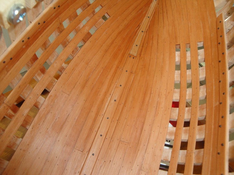 Ja nie twierdze, ze nie wykonywano najpierw poszycia wewnetrznego. To nie o to chodzi. Ten wspornik pod pokladniki jest w La Belle (podobnie jak i w innych jednostkach, np. Granado) przybijany bezposrednio do wreg (moze byc traktowany jako czesc poszycia) i dopiero na ten wspornik przychodza pokladniki i tez to dziobowe wzmocnienie. NA wspornik a nie z boku do wspornika, jak twierdzil Mati. Tak to robia inni modelarze i tak mi to mowia plany, jesli je dobrze interpretuje.