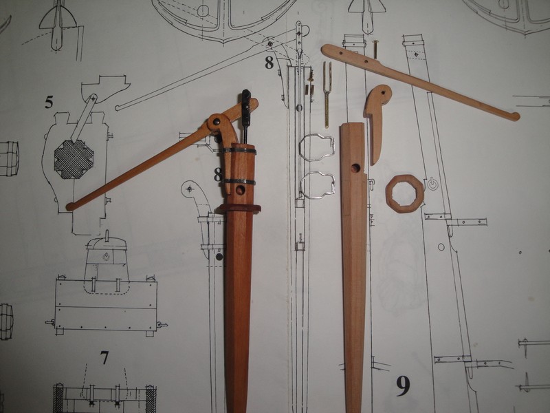 Trwa dalszy ciag pracy przy pokladzie, wystrugalem pompy i nastepnego pacholka. Obrecze pomp sa zrobione z cynowego drutu 1mm rozklepanego na 2mm (lepiej sie profiluje niz mosiadz). Do barwienia cyny uzylem wczesniej wspomnianej tinktury (relacja Niagary, na zdjeciu po prawej stronie). Mosiadz czernilem, jak zwykle, roztworem kwasu selenawego (lewa strona, rozcienczony 1:1 z woda) znanym z rusznikarstwa.