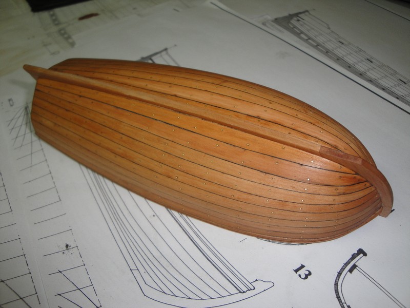 Szalupa dostala poszycie (5x1,5mm). Kolkowalem w trakcie kladzenia poszycia, zeby lepiej trafic w poszczegolne wregi (drut mosiezny 0,5mm).