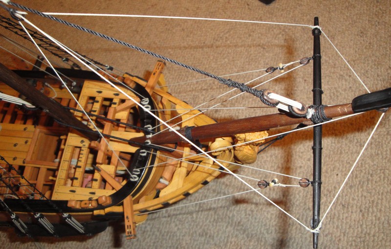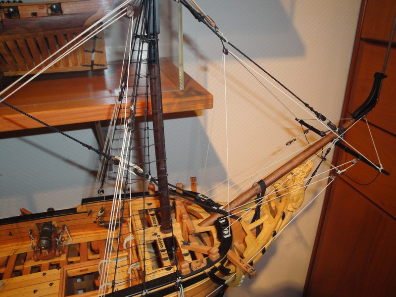 Ikemot, podstawa olinowania w ksiazce Peterssona byla angielska fregata "Melampus". Jean Boudriot opisuje w swoich ksiazkach (np 74-dzialowiec) jednostki francuskie. Nie wiem czy to jest powodem tej roznicy w olinowaniu. Poniewaz moj model, LB jest jednostka francuska, i w jej planach tez zostalo uzyte rozwiazanie podane przez Boudriota (jest on tez autorem tych planow), zastosowalem sie do reguly opierania sie na posiadanych planach (co nie musi znaczyc ze nie istnialy dwa rozwiazania:angielskie i francuskie).