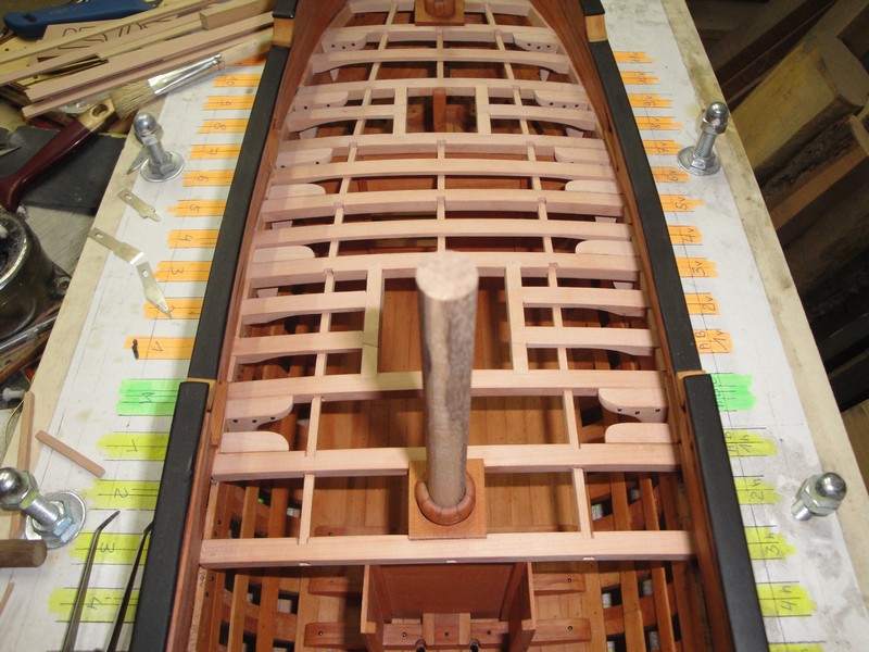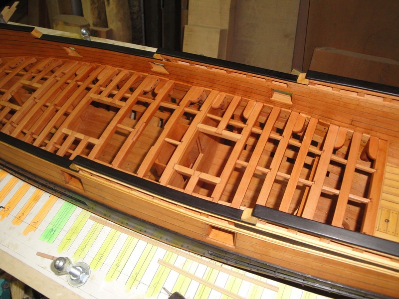 Po krotkiej przerwie spowodowanej urlopem, przyszla kolej na klejenie konstrukcji pokladu. Wsporniki pokladnikow zostaly wyciete (CNC-dzieki Mirku) i dopasowane do profilu kadluba.