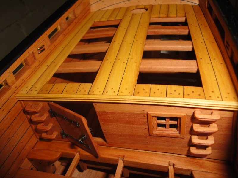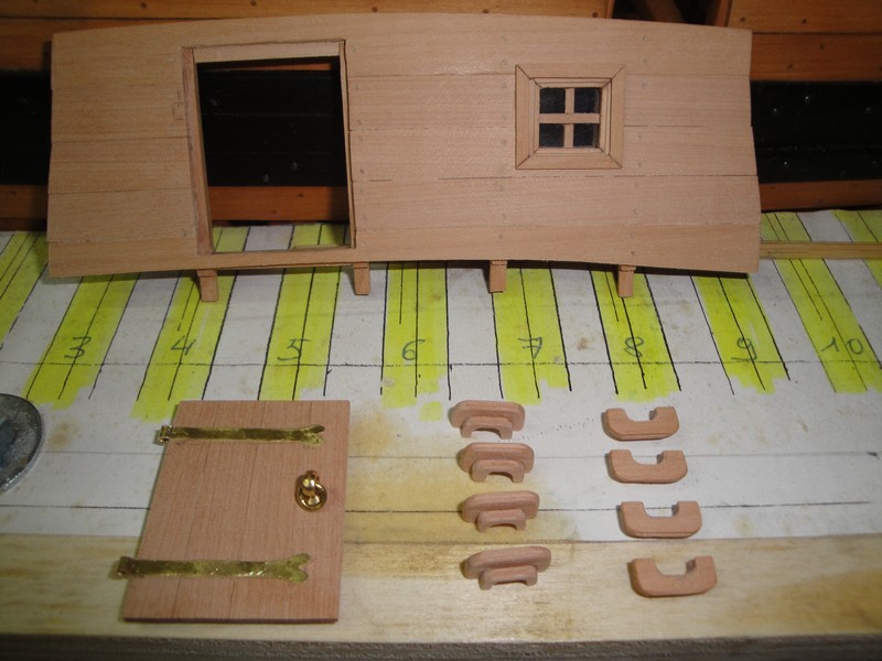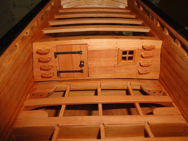 Przyszla kolej na kabine kapitanska. Zamocowalem pokladniki i skleilem scianke dzialowa. Drzwiczki sa stosunkowo niskie (ca 1m) ale nic na to nie poradze (tak jest na planach, na wiecej nie ma miejsca). Trzeba sie mocno schylac wchodzac do kabiny. Tyle na temat rozbierznosci miedzy planami i rzeczywistoscia. W miejscu styku scianki z burta przyjdzie jeszcze listwa dekoracyjna. Szczelina pod scianka przeznaczona jest na deski pokladu.