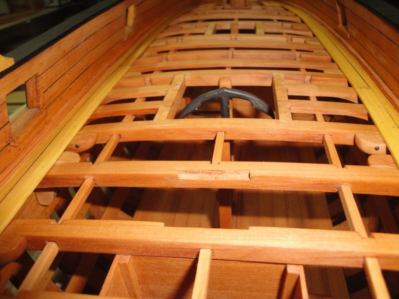 Przyszla kolej na deskowanie pokladu. Na poczatek, po dwie deski przy burtach (bukszpan, 1,8x8mm) oraz waterway, prza dziobie deskowanie tylko zaznaczone. Doszedl tez szkielet nadbudowki dziobowej (jeszcze nie klejona bo trzeba bedzie dopasowac pacholki).