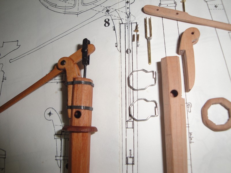 Trwa dalszy ciag pracy przy pokladzie, wystrugalem pompy i nastepnego pacholka. Obrecze pomp sa zrobione z cynowego drutu 1mm rozklepanego na 2mm (lepiej sie profiluje niz mosiadz). Do barwienia cyny uzylem wczesniej wspomnianej tinktury (relacja Niagary, na zdjeciu po prawej stronie). Mosiadz czernilem, jak zwykle, roztworem kwasu selenawego (lewa strona, rozcienczony 1:1 z woda) znanym z rusznikarstwa.