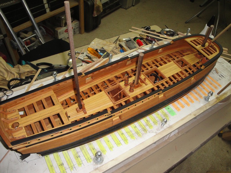 Prace przy deskowaniu pokladu zostaly zakonczone (przynajmiej tak mi sie wydaje). Przez pozostawione otwory mozna jeszcze sporo podpokladu zobaczyc.