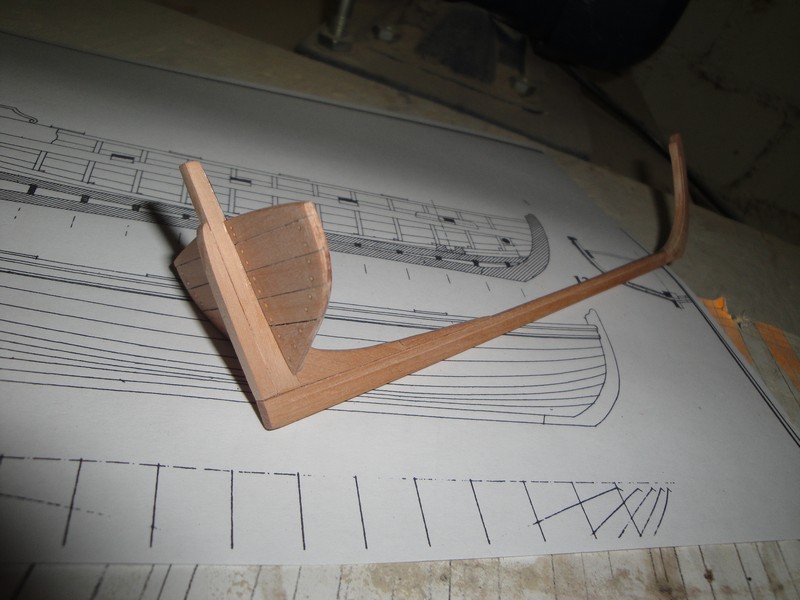Szalupa dostala poszycie (5x1,5mm). Kolkowalem w trakcie kladzenia poszycia, zeby lepiej trafic w poszczegolne wregi (drut mosiezny 0,5mm).
