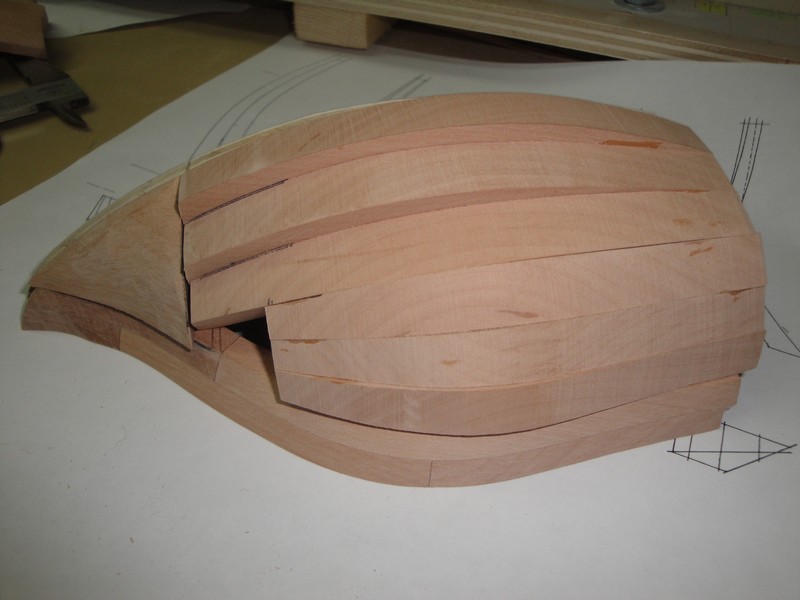 Zabralem sie za krzywulce na dziobie. Zastosowalem metode z szablonem i sukcesywnym przymierzaniem i szlifowaniem krawedzi (podobnie jak Kagra w swojej relacji). Po zastosowaniu lekkich korektur, wyszlo jak wyszlo.