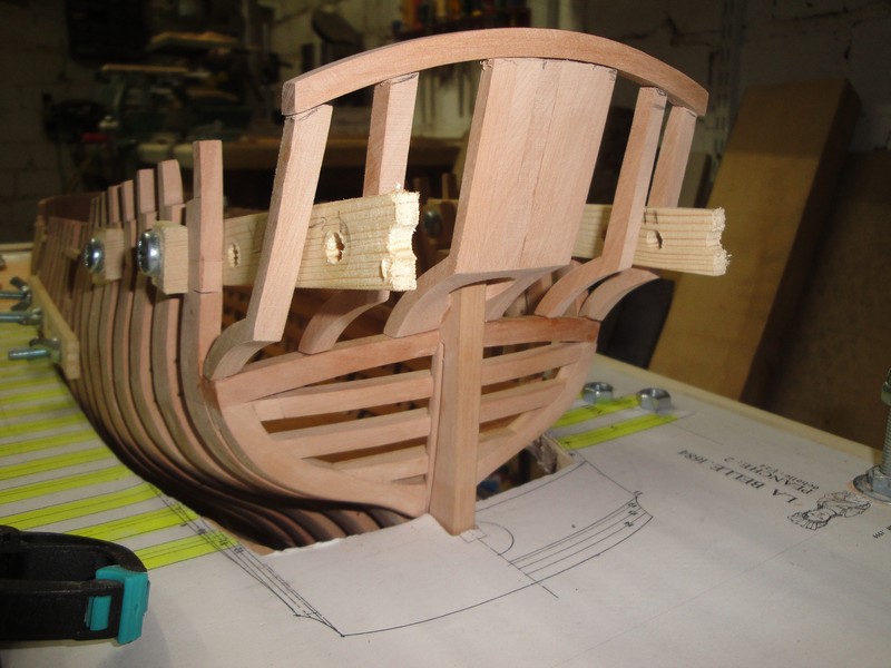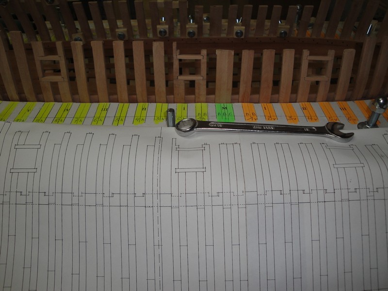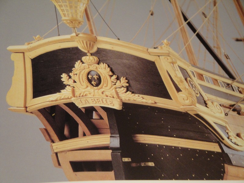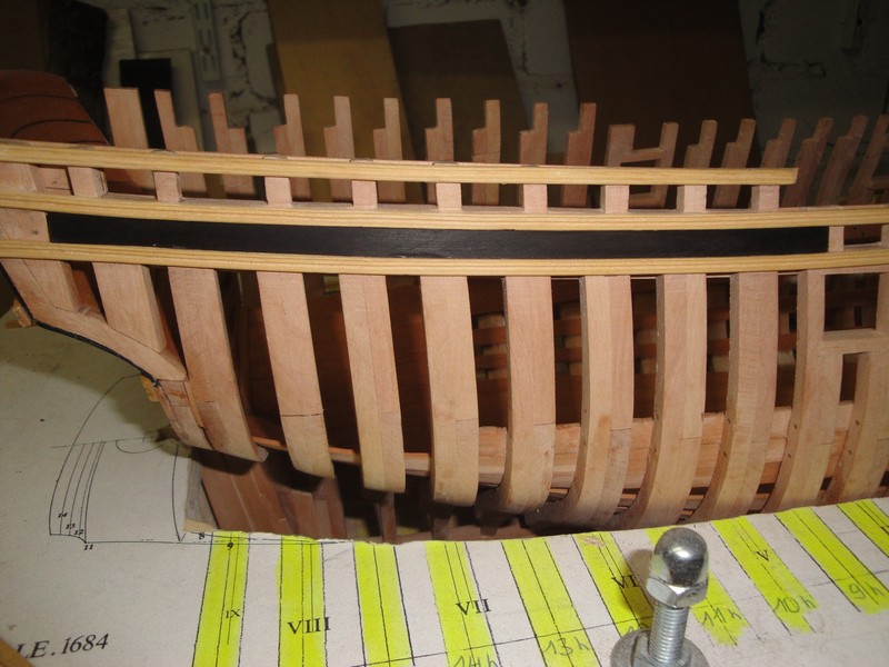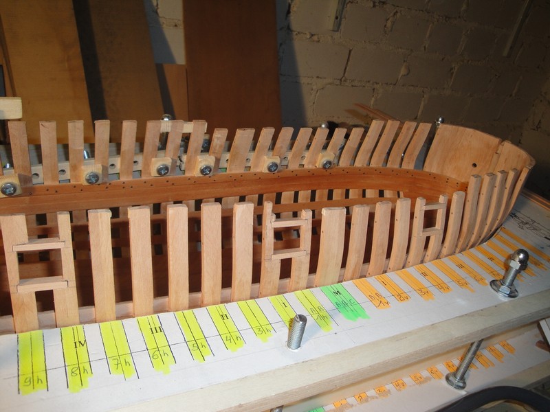 Amputowalem konce wreg wedlug planow po kilkukrotnych przymiarkach uzywajac do tego celu mini-wyrzynarki Proxxona. Wyznaczylem i wycialem luki dzialowe przy pomocy laubzegi ze spiralnym brzeszczotem. Wykonczylem wstepnie oramowanie luk (jeszcze nie poklejone ). Tak na marginesie maly dodatek do dyskusji o rozmieszczeniu tych luk dzialowych na burtach. La Belle ma tylko trzy po kazdej stronie. Przy wyznaczaniu pozycji tych luk, stwierdzilem ze odleglosci pomiedzy nimi wcale nie sa rowne
