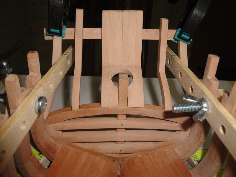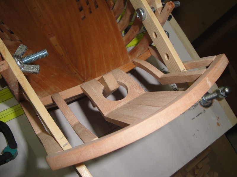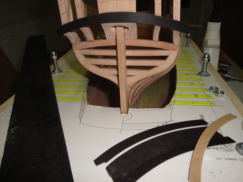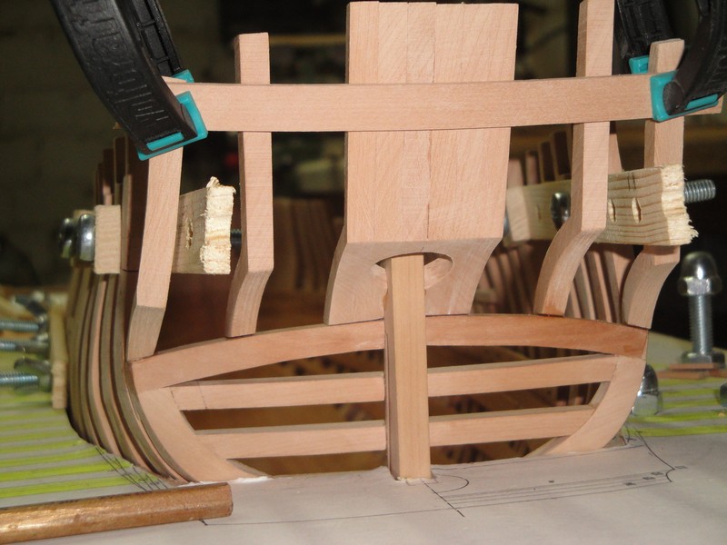 Po korekturze wyzej wymienionej "amputacji" wreg w okolicy rufy (zabraklo mi 8mm w odniesieniu do gornej krawedzi rufy i musialem wlepic odpowiednie przedluzenia, ale poniewaz burty powyzej odbojnic beda obustronnie pokryte poszyciem, to nic sie nie stalo), zabralem sie za konstrukcje szkieletu rufy.