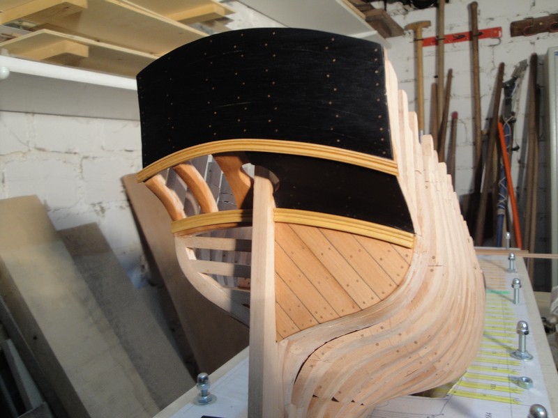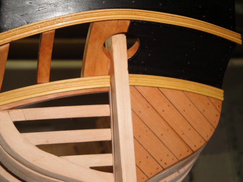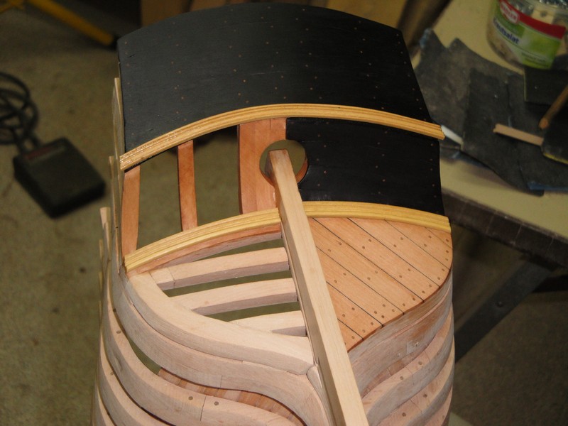 zabralem sie za pokrycie rufy. Gorna czesc jest czarna wiec uzylem hebanu. Przy pomocy szablonu wycialem odpowiednio wygiete listwy. Nie musialem zwracac uwagi na sloje, bo przy hebanie ich nie widac. Kolkowanie 0,8mm brazowym bambusem.