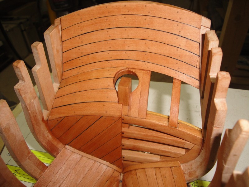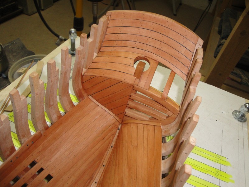 ciag dalszy pokrywania rufy, tym razem od wewnatrz, analogicznie jak poprzednio (szablony, krzywulce wyciete i dopasowane, szerokosc desek 9mm, grubosc 1,5mm).