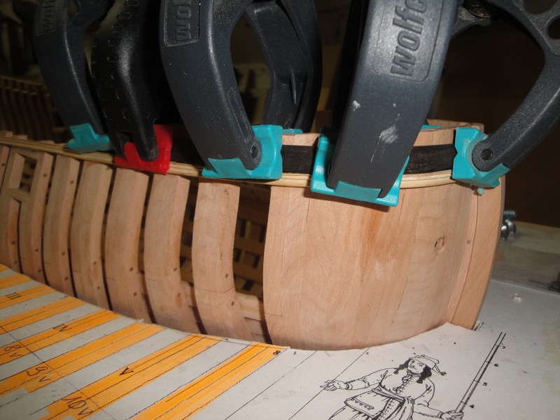 Wyprobowalem nowa zabawke, szablon do krzywych profili. Dziob ma za duza krzywizne, zeby listewke hebanowa, 1,5mm grubosci odpowiednio wyprofilowac. Przenioslem ten luk na heban 10mm grubosci, i wycialem z pelnego materialu odpowiedni profil. I co powiecie, pasowal do burty dziobowej.