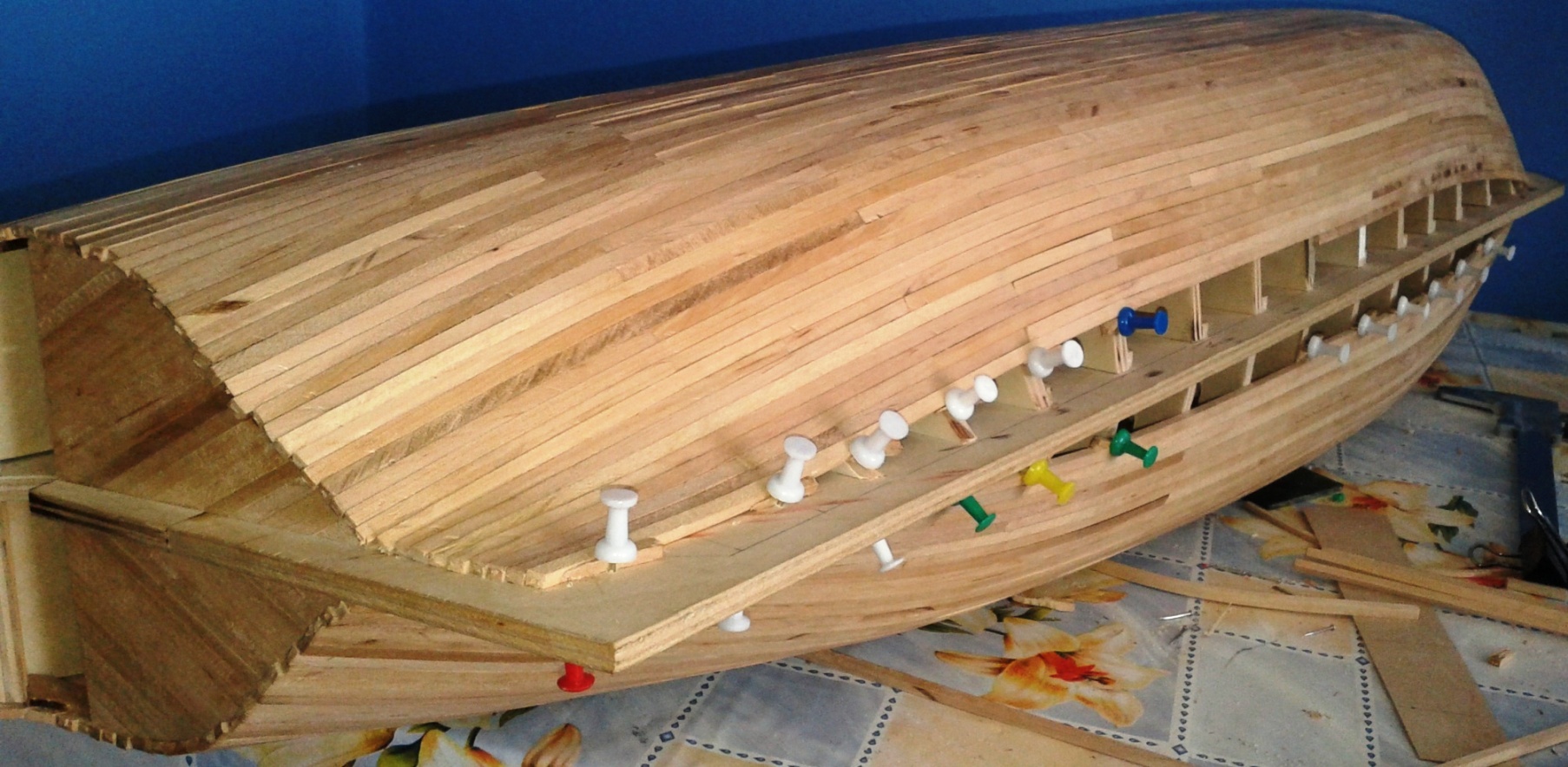 Skala 1:50, trochę przesadziłem, już teraz kadłub ma blisko metr długości, a jak dojdzie bukszpryt... Nie wiem, gdzie zmieszczę taką gablotę