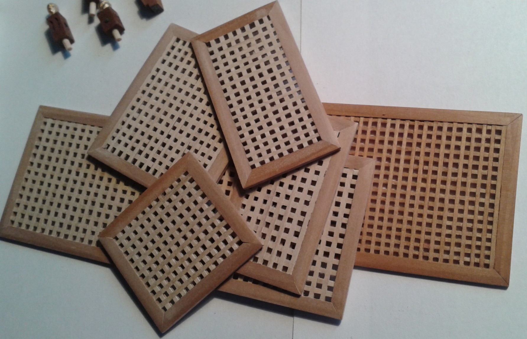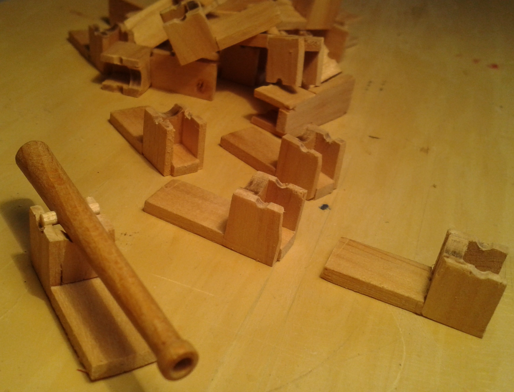 Listwa wyprofilowana w kształt bloczka:Frez piłkowy zamocowany w pilarce. Wyregulowana wysokość i ogranicznik:I wycięty w ten sposób rowek:Odcięte bloczki z rowkami:Wiercenie otworów z użyciem prostego szablonu:A to uchwyt do bloczków na czas szlifowania. Trzy szpilki umieszczone w kawałku drewienka z otworami wywierconymi wg. poprzedniego szablonu:I gotowe Jufersy, przed barwieniem:Oczywiście to nic odkrywczego, ale postanowiłem to zamieścić na forum, może przyda się komuś, kto ma ambicje wykonać bloczki samodzielnie