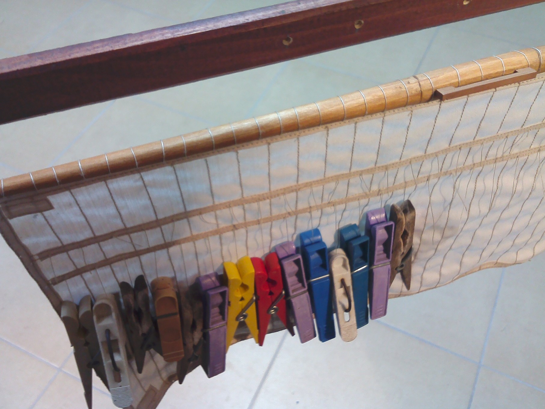 Już po zawieszeniu dwóch żagli okazało się, że w dalszym ciągu mam za mało bloczków. Na te dwa małe żagielki poszło ich prawie 40.