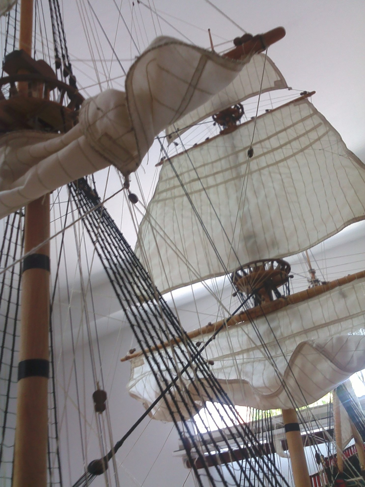 I żagle wraz z rejami gotowe do dalszej "obróbki", czyli montażu pert, lin i całego zestawu bloczków.