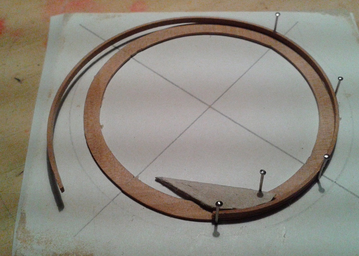 A tak powstają platformy marsów:Papier milimetrowy znacznie ułatwia pracę. Listewki brzozowe 3x1.5mm mocuję do papieru klejem biurowym, a ich czoła sklejam wikolem. Następnie powierzchnia zostanie wyszlifowana i doklejona będzie podstawa marsu. Potem zeszlifuję papier i nadam elementowi kształt koła.