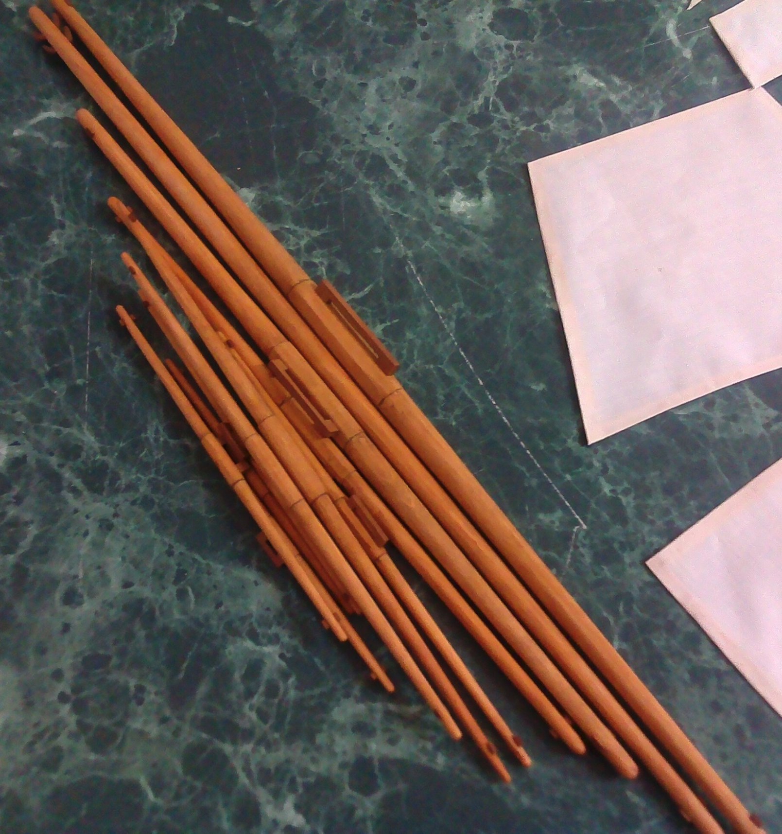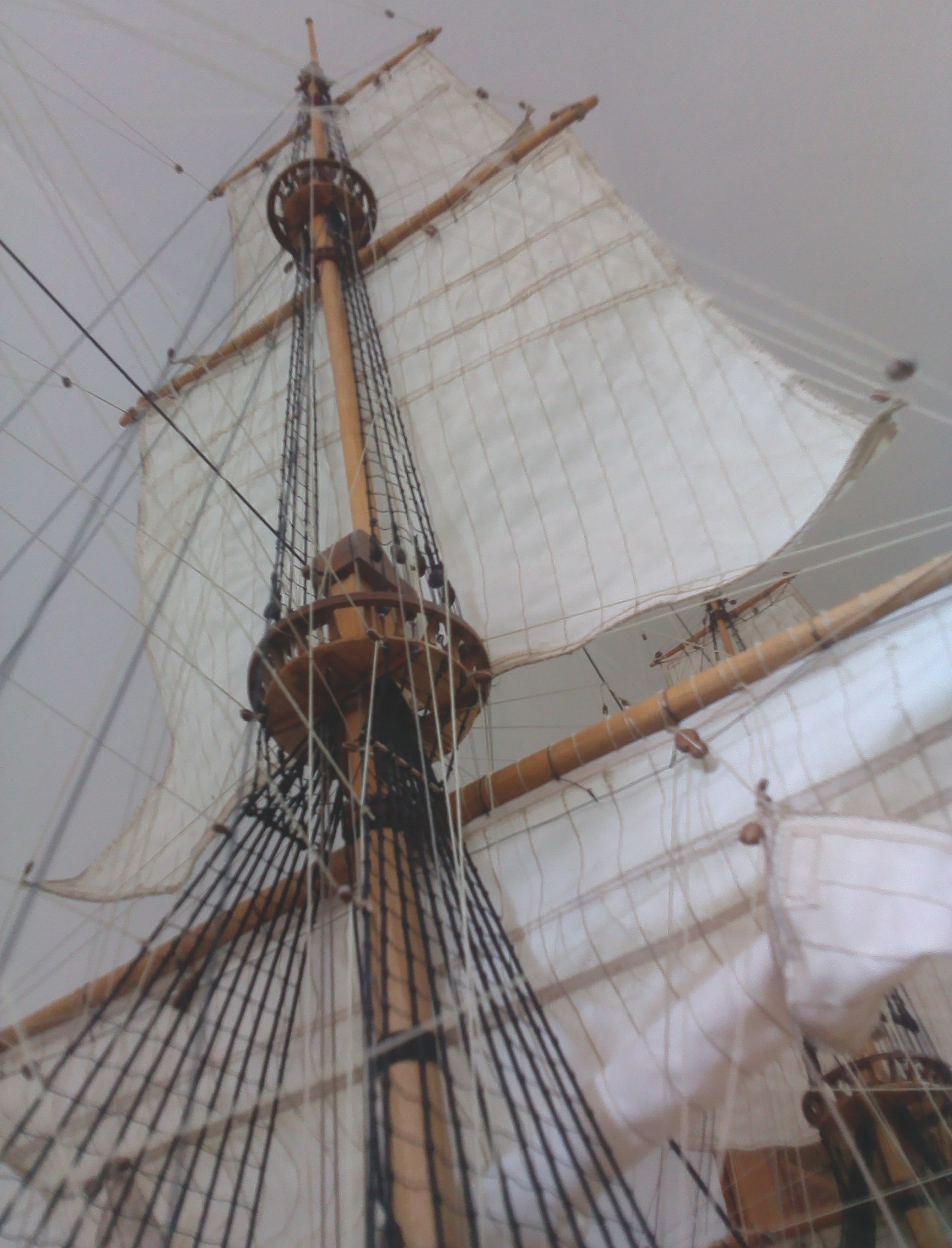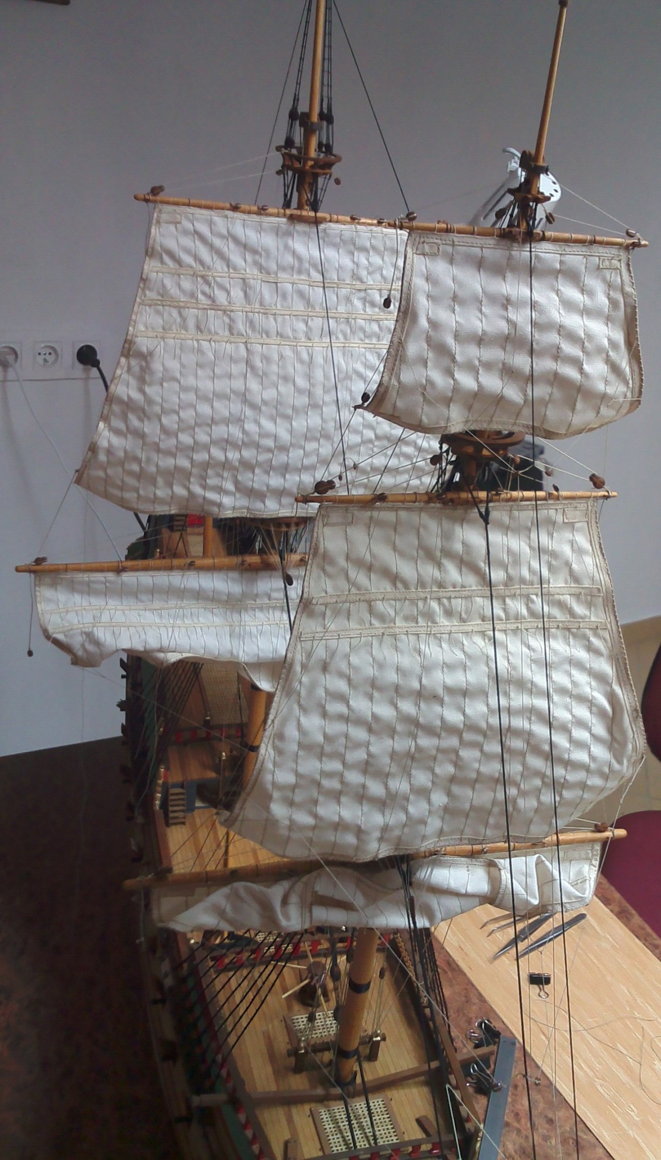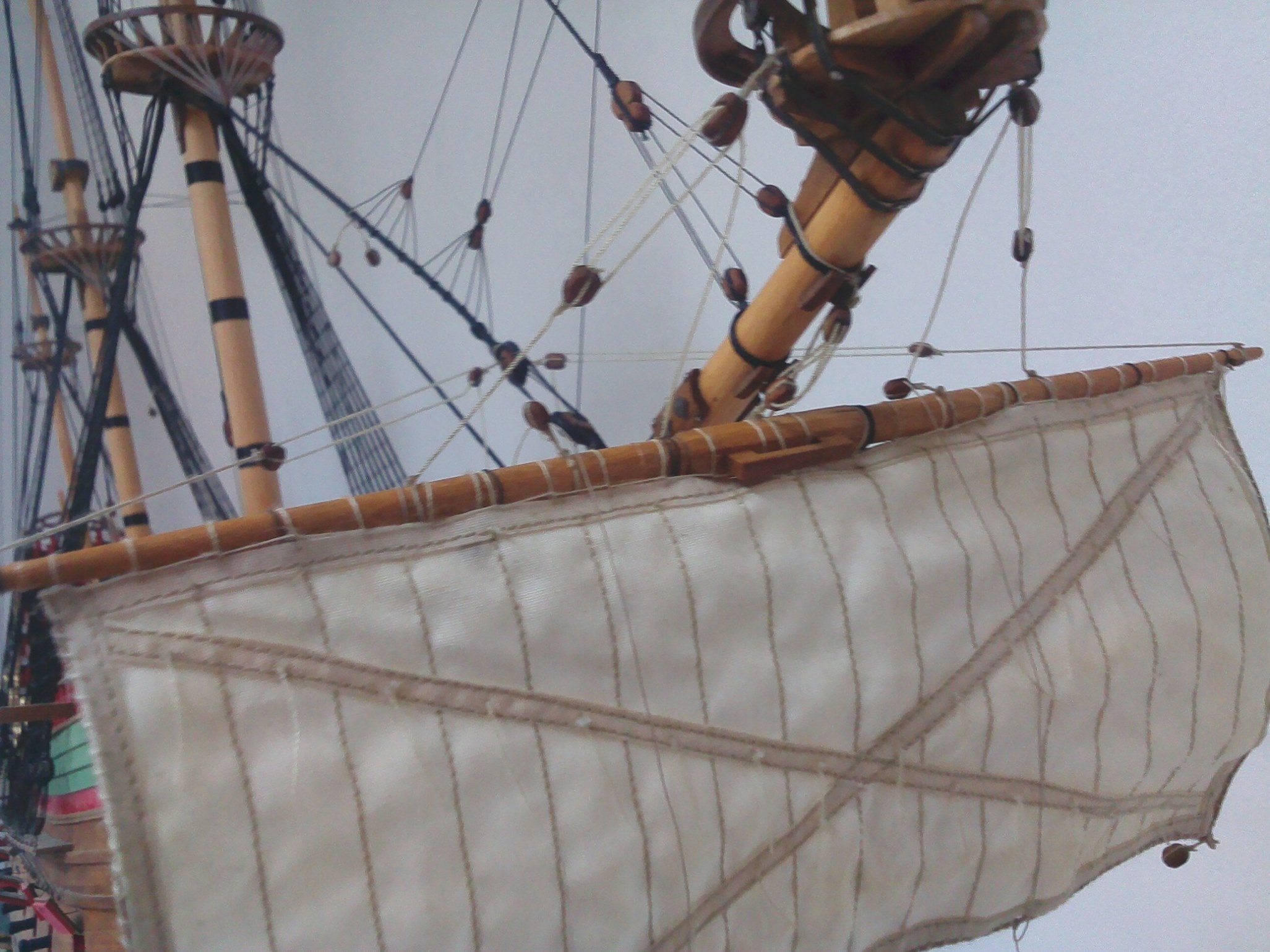 I żagle wraz z rejami gotowe do dalszej "obróbki", czyli montażu pert, lin i całego zestawu bloczków.