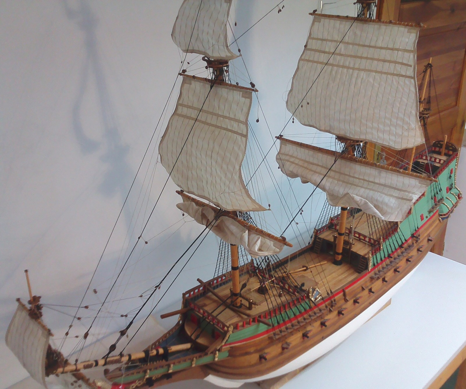 Tak wykonane żagle lądują w pudełku, bo chwilowo nie dysponuję maszyną do szycia. Dodam jeszcze, że fokżagiel i grotżagiel wykonałem o 15% krótsze, gdyż będą one częściowo zrefowane. Pozwoli to uzyskać nieco bardziej naturalny ich wygląd.