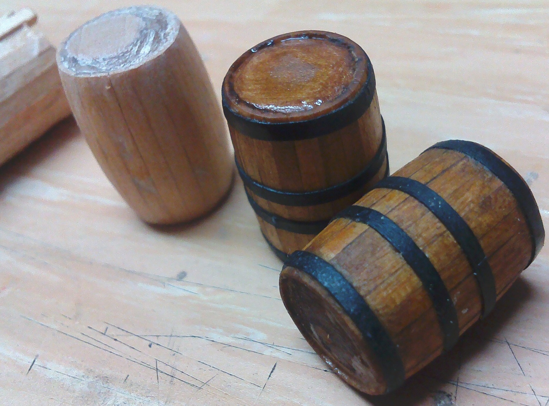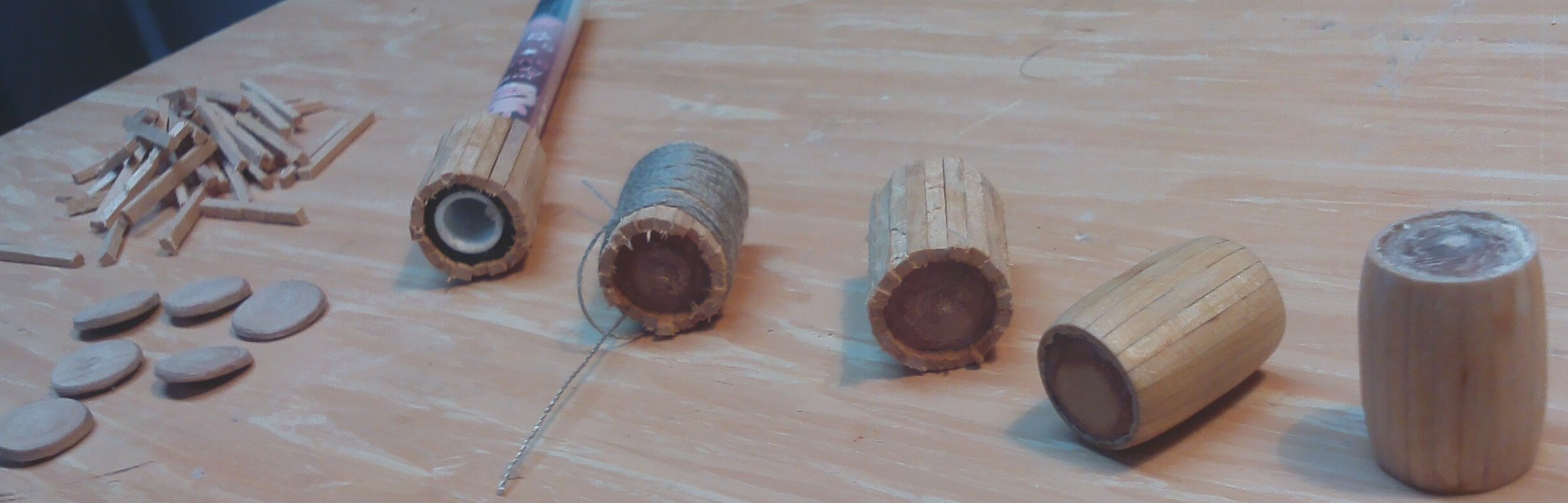 Kolejne etapy ich powstawania; klepki olchowe o przekroju trapezowym, denka wytoczone z gruszy: