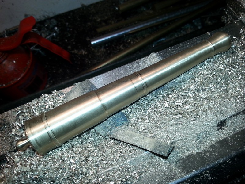Aby nie być posądzonym o plagiat,postanowiłem zrobić swoją armatę z Le Fleuron w skali 1/24.Jest to armata 24 funtowa z bogatymi ornamentami.Na początek zakupiłem wałek mosiężny fi 22 mm o długości ok 20 cm, armata w tej skali ma 141,25 mm (+/- grubość linii na rysunku).