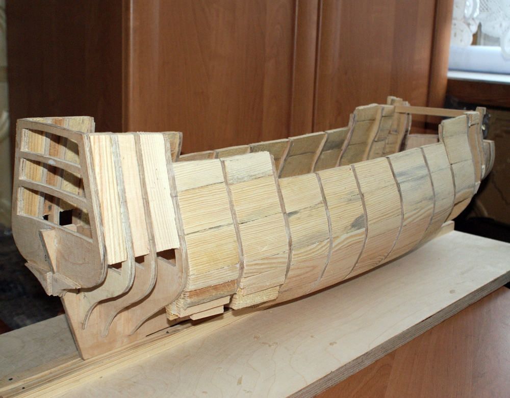 Andrzeju, mam zamiar zrobić wszystkie pokłady i dopiero wtedy przystąpić do poszywania. Do zrobienia pozostały nadburcia na śródokręciu i rufie i będę je robił po wykonaniu pokładów. Pokład główny wykonam z dwóch części, ponieważ będę musiał go dopasowywać w części rufowej i dziobowej. Trochę zaskoczony jestem tym co napisałeś o gięciu obłogu. Myślałem że obłóg o grubości 2mm ucięty na szerokość 4mm będzie listewką którą można wyginać tak jak zwykłe listewki. Szkoda że tak nie jest, bo stwarza to trochę problemów.
