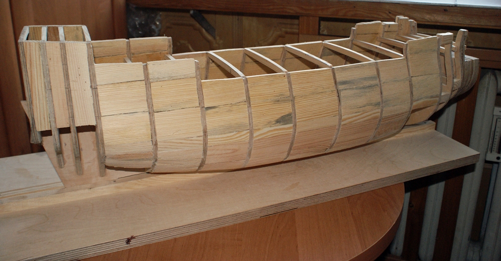 Szkielet i wręgi wyciąłem ze sklejki 6 mm. Szkielet jest umieszczony w prowizorycznej stoczni za pomocą trzech wypustów które zostaną później usunięte. Wypełniam go listwami świerkowymi.