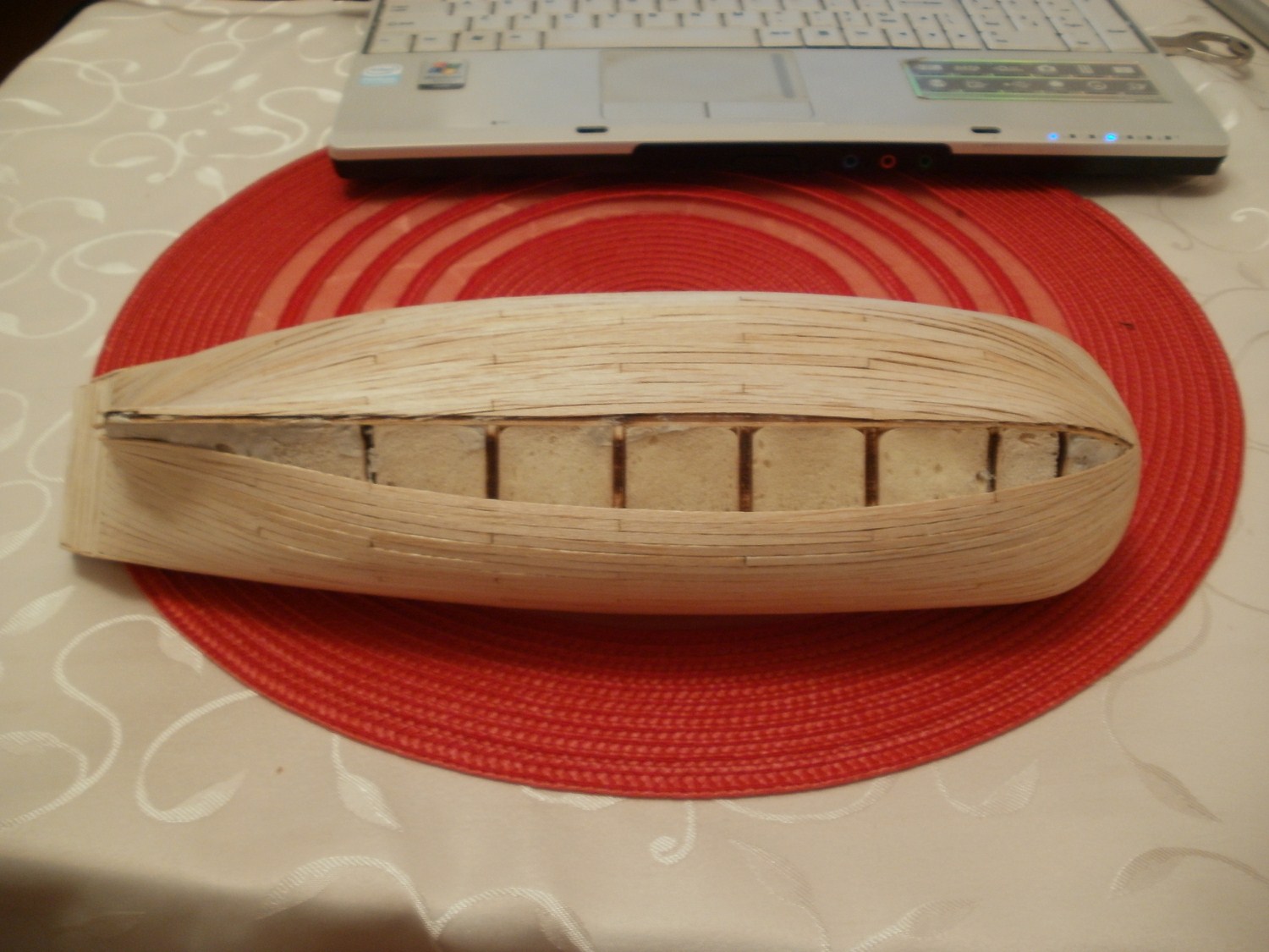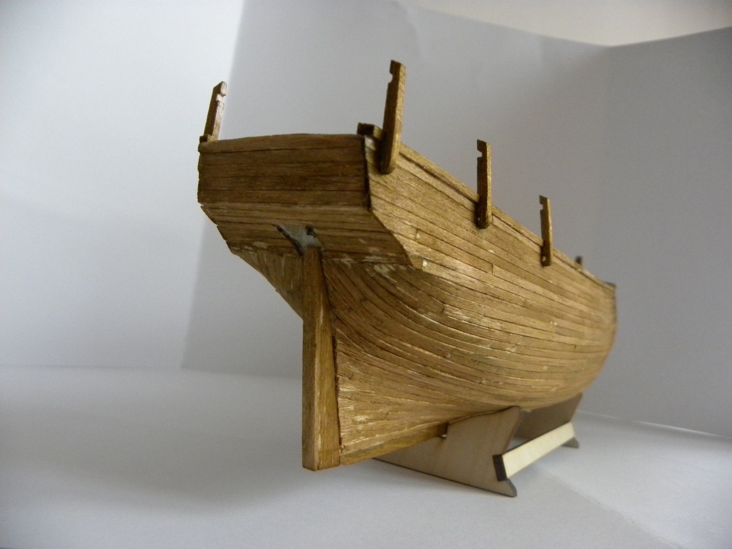 Po dokładnym usunięciu nierówności i uzyskaniu gładkości dokleić stępkę, stewy i wykończyć nadburcie co jest oczywiste. Następnie :