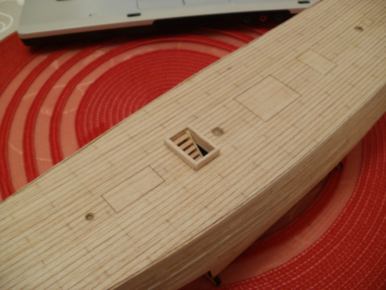 W między czasie zrobiłem tylko parę detali a wczoraj przyszła bejca w proszku więc pomalowałem i wypłynął mój brak doświadczenia. Na pierwszy rzut oka unaoczniło się nieuważne przyklejanie poszycia, jasne plamy w miejscu ubrudzenia klejem, kleiłem cyjanoakrylem bo było wygodnie. Do tego doszło mniej uwagi przy doborze odcieni deseczek co też ukazało się po nałożeniu bejcy. Do tego moja niecierpliwość w czekaniu na bejce i przyklejenie słupków dało efekt w postaci zacieków wokół nich. No ale człowiek uczy się na błędach.